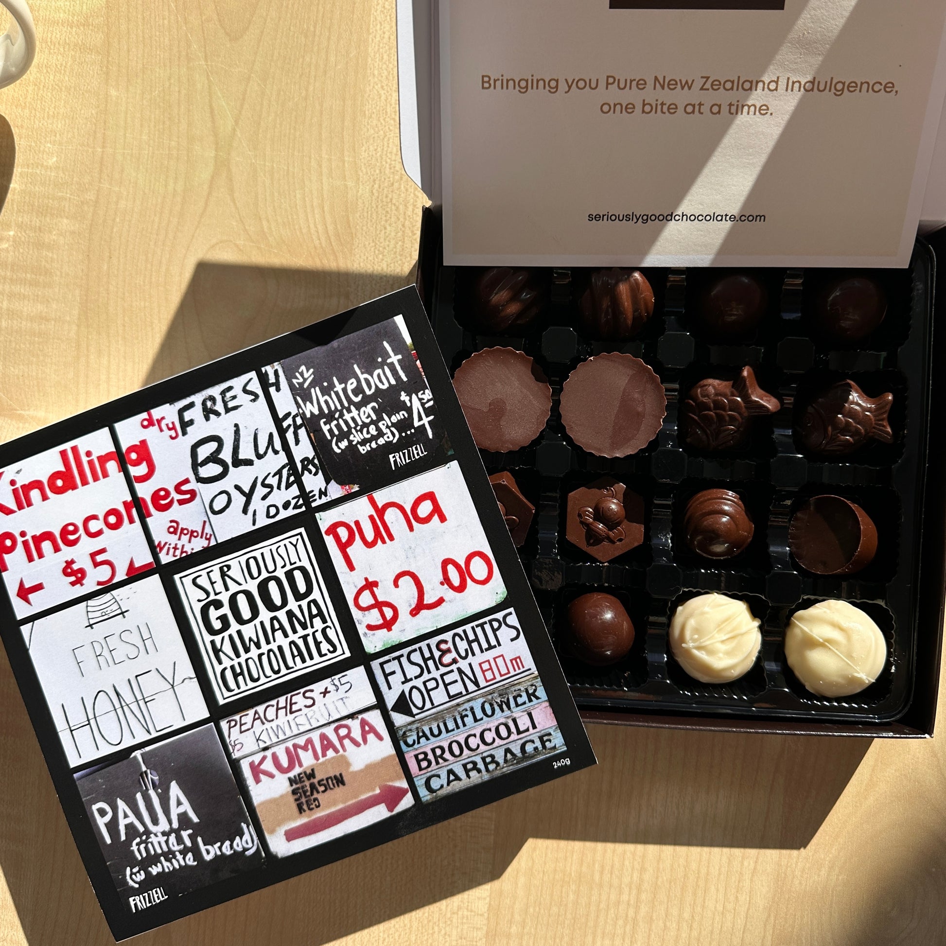 Inside? Seriously good chocolate, made in New Zealand – rich, smooth, and full of flavour.